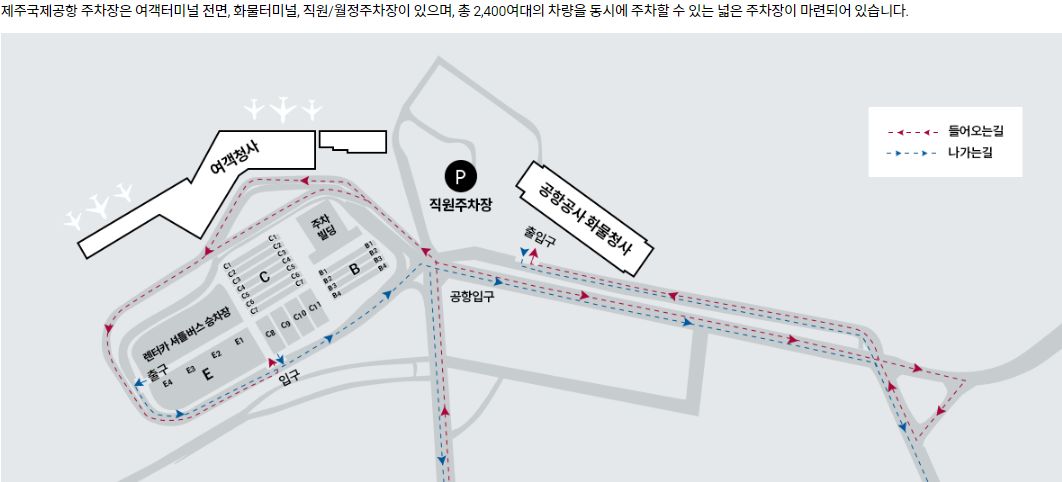 제주공항 주차장은 여객터미널 전면, 화물 터미널, 직원 월정 주차장이 있으며, 총 2,400여대의 차량을 동시에 주차할 수 있는 넓은 주차장이 마련되어 있습니다.