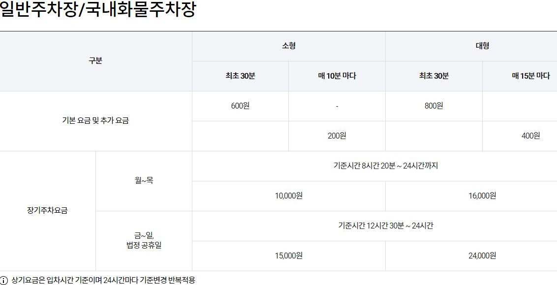 제주공항 주차요금 월요일~목요일 기준시간 8시간 20분 ~ 24시간까지 장기주차 요금은 소형 기준으로 10,000원이며, 금요일, 토요일, 일요일과 법정공휴일은 기준시간 12시간30분 ~ 24시간 15,000원 입니다. 제주공항 주차요금은 입차시간 기준이며 24시간마다 기준변경 반복적용 됩니다.