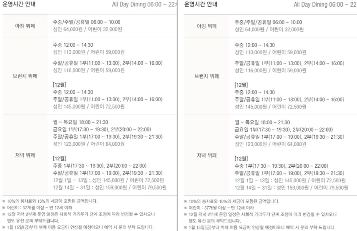 신라호텔 뷔페 더파크뷰 가격은 1월15일(금)부터 가격이 인상될 예약이라고 하니 예약 시 미리 문의를 하는것이 좋다고 합니다. 신라호텔 뷔페 더파크뷰 가격도 가격이지만 약 한달전에 미리 예약을 해야만 이용이 가능하다고 하니 서울 신라호텔 더파크뷰 02-2230-3374 전화번호 미리 예약 후 방문하시는데 도움이 되었으면 좋겠습니다.